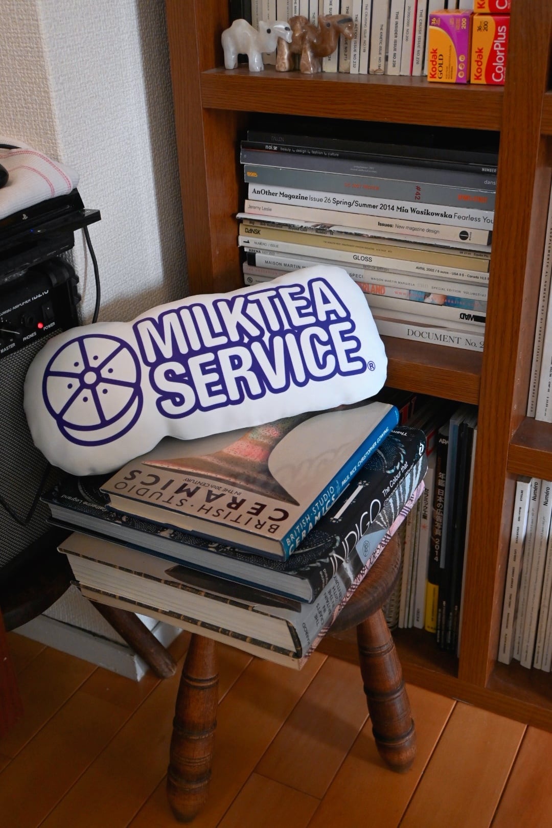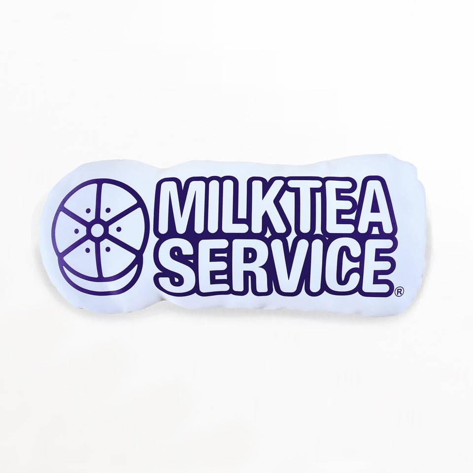 PC作業にも、軽いお昼寝にも適したMILK TEA SERVICEのロゴクッション。